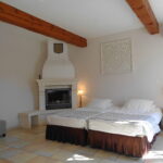 Ampia affitacamere a Lacoste in Provenza di 25 m², dotata di letto king-size 180×190 o 2 letti 90×190 con terrazza privata e camino in pietra di Ménerbes.